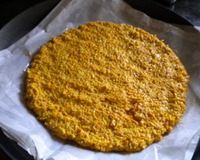 - Place a parchment paper on a baking tray and grease the paper with oil. Dump the cauliflower masala in the center of the paper and pat with your finger tips to form an 8 inch disc.