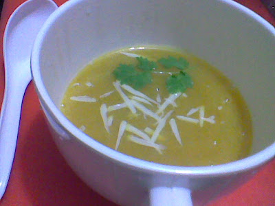 I had some left over pumpkin in the fridge and was pondering over what to do with them when this soup came to my mind. Adding potato to this soup gives it a nice creamy texture and thickness without having to add corn flour to it. A steaming cup of it does wonders on a cold evening. So here goes the recipe….