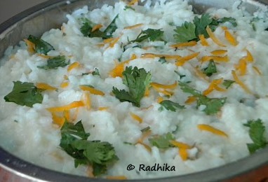 Cook rice using 5 cups of water instead of the usual 4 cups of water. The rice should be over cooked. Mash the rice well with a pappu gutthi. In a kadai heat the oil. Add mustard seeds, when they crackle add the curry leaves, asafetida, chopped carrots, green chilli and ginger.