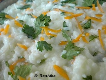 Cook rice using 5 cups of water instead of the usual 4 cups of water. The rice should be over cooked. Mash the rice well with a pappu gutthi. In a kadai heat the oil. Add mustard seeds, when they crackle add the curry leaves, asafetida, chopped carrots, green chilli and ginger.