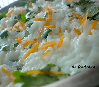 Add grated raw mango during the season. You can avoid milk and make the rice with just curd alone. Make sure that the curd is not sour.