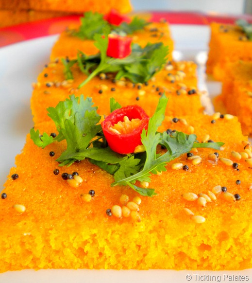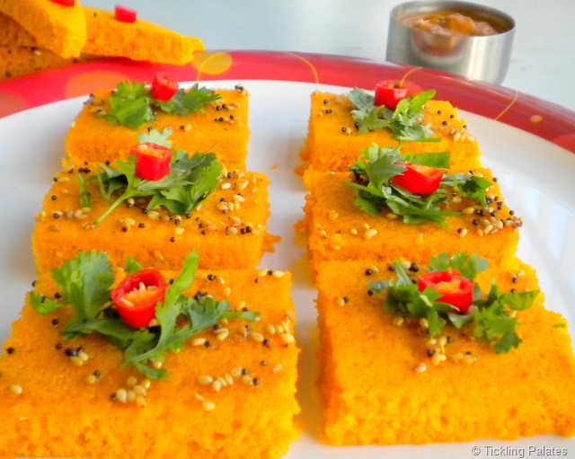 Love the color of your Dhoklas…Love the addition of tomatoes.