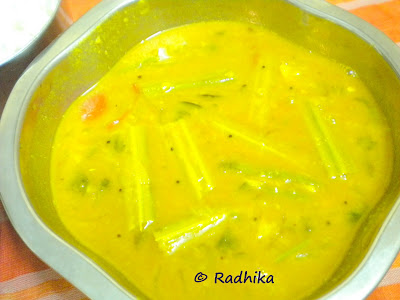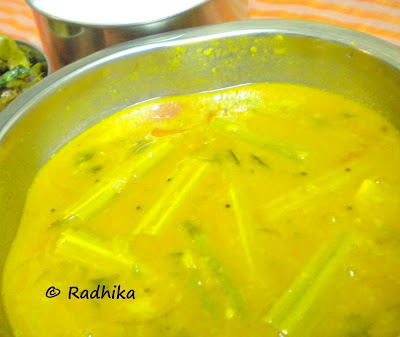 Drumstick known as Murungakkai is available almost through out the year and it is very good for the strengthening of our nerves. It maintains the strength of our nervous system and good for our eyes. here is a sambar recipe using drumsticks.