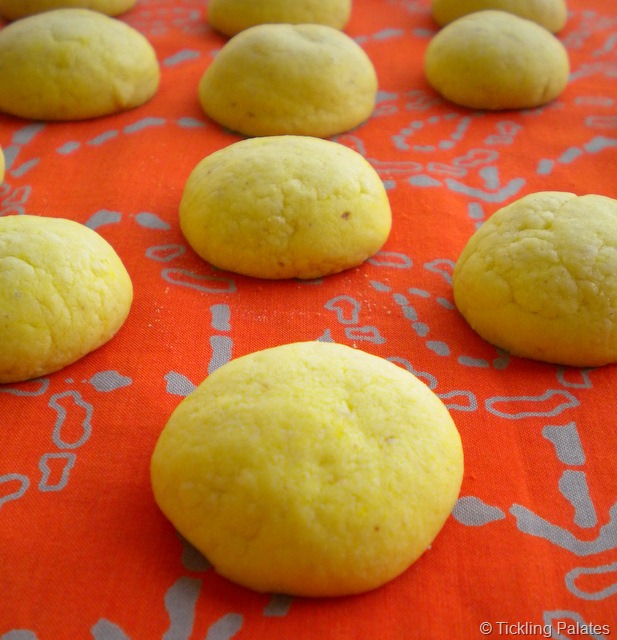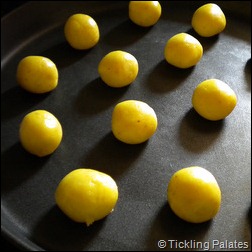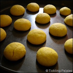 After 1/2 hour make small balls of the dough and arrange on the prepared baking tray leaving enough space between the cookies and bake for 10 min or until they are firm to the touch. The cookies will harden on cooling down to room temperature.