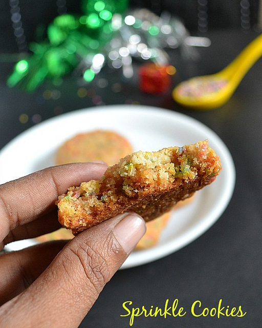 Eggless Sprinkle Cookies with step by step photos. The colorful sprinkles added to the cookies will not only bring in more colors to your cookie bin but will add to the festive spirit around Christmas time.