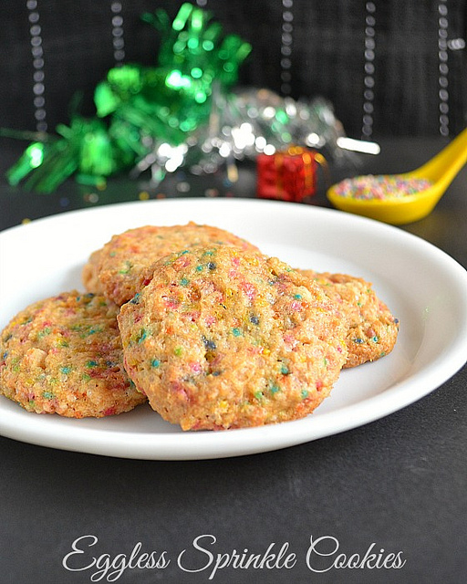 It has been my long time wish to bake these sprinkle cookies and finally baked these cookies as eggless ones. Do excuse the clicks as they were taken very late in the evening.