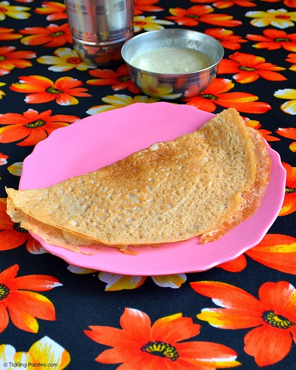 I would call this Instant Godhumai Dosa recipe aka “karacha maavu dosa” in my place as a real life saver. When you are left with just a 2-3 ladles of dosa batter with no idea of what do make for breakfast or dinner, you can use it for making this Instant Whole wheat flour dosa (Crepes) without wasting that left over batter. Even if I do not have dosa batter, I use a small amount of rice flour to make this dosa as it prevents the dosa from being slimy, also the edges come out crisp like I always prefer. You do not have to waste time for grinding the batter or wait for it to ferment, but you have your meals on the table in under 15 mins with this Instant Dosa version as they so quick and easy to make that is light on the stomach.