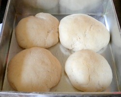 - Sprinkle your work surface lightly with whole wheat flour and place the dough on it. Divide it into 8 equal pieces and shape each one into a roll by flattening it and then pinching the ends together to form a smooth ball. Place the rolls on a lightly greased baking sheet and cover them with a towel. Let them rise for about one hour (about 1 1/2 to 2 hours for refrigerated dough) till pressing with a finger on the top leaves a dent.