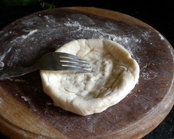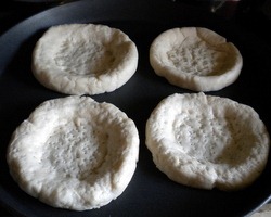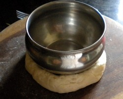 - Work on one piece at a time, while you keep the others covered so they don’t dry out. When the rolls are ready, pick them up one at a time and place it upside down on the work surface. Grease a small bowl on the outer with oil. Place the bowl on the roll press gently using rotating motion so that it makes an indent in the middle. Now use finger tips to perfect the indent. Make sure you do not poke a hole in the middle. Remember not to press on the edges, or they will flatten out. Once shaped, you should have a depression of about 3” in diameter with 1” of puffy dough around the edge, so your Bialy should be about 4” in diameter. Prick the center of the Bialy with a fork so the center doesn’t rise when baking.