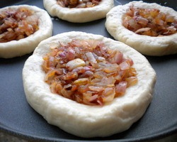 - Place the shaped dough on a parchment lined (or greased) baking tray leaving about 2 inches space between them. Place the caramelized onion filling in the depressions of each Bialy. Brush the outer dough circle with milk.