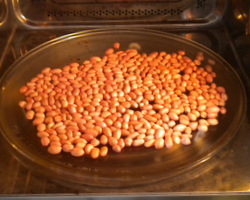 2. Just spread the peanuts on the rotating plate and microwave at high for 1.5 minutes first. Open the door to let the steam out and with the help of a spatula just spread them once again and micro at high for another 1.5 minute.