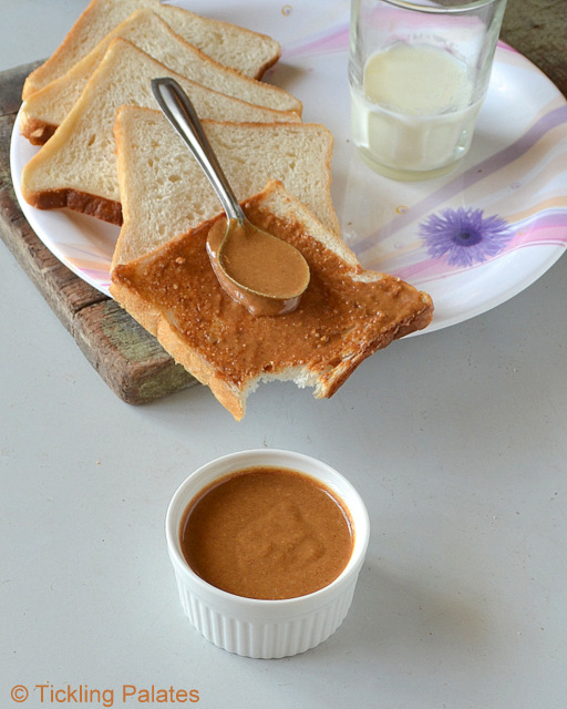 This chocolate peanut butter will be your own homemade version of Nutella, if you happen to love it and eat it by spoonfuls. Yumm…, right. Whenever I think of the fact that I actually went and bought a peanut butter jar from the shop only to give it away to a friend as the kiddo did not like it and I myself did not know what to do with it many years ago, I feel like kicking myself, that I wasted the bucks on something that could be made so easily at home with only a handful of ingredients.