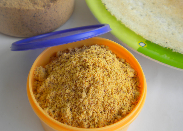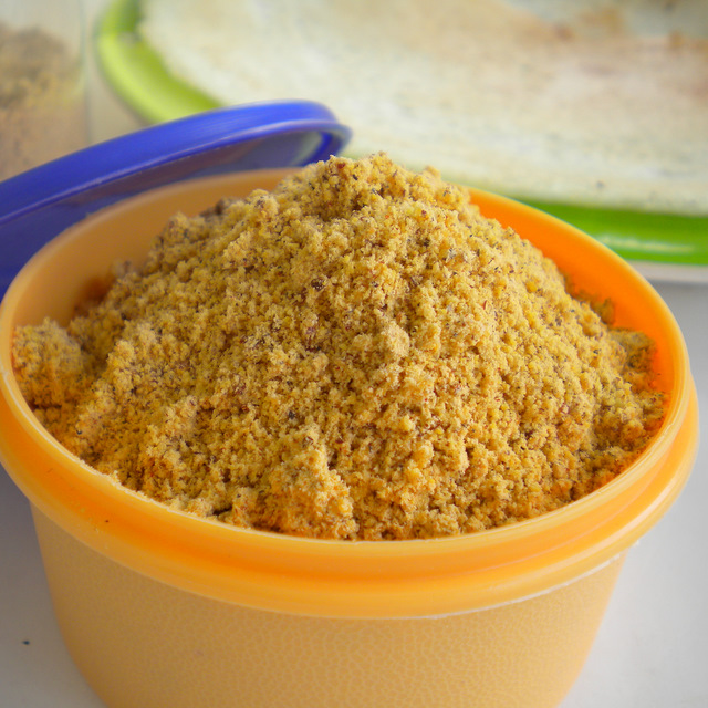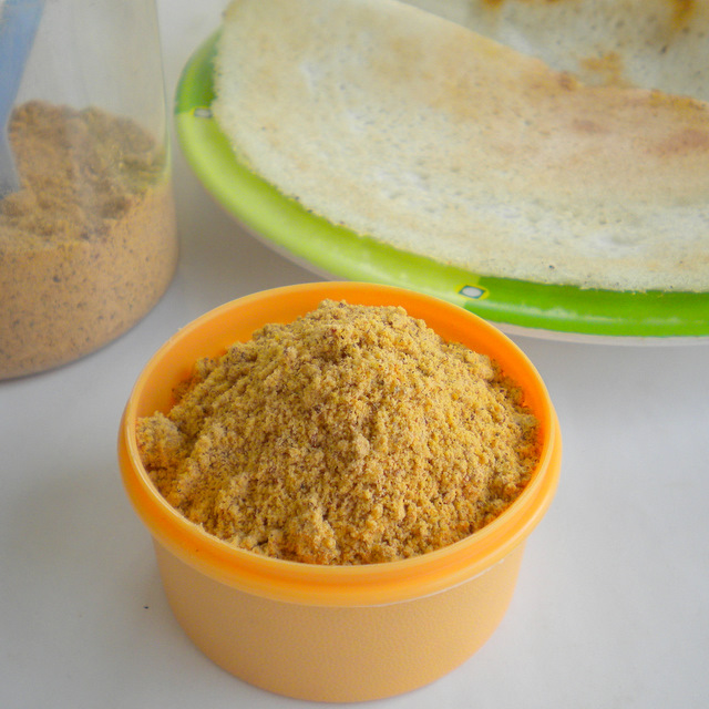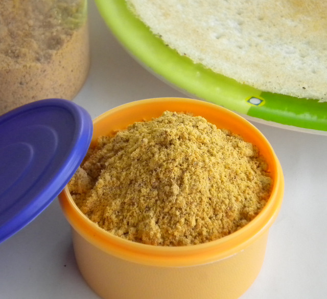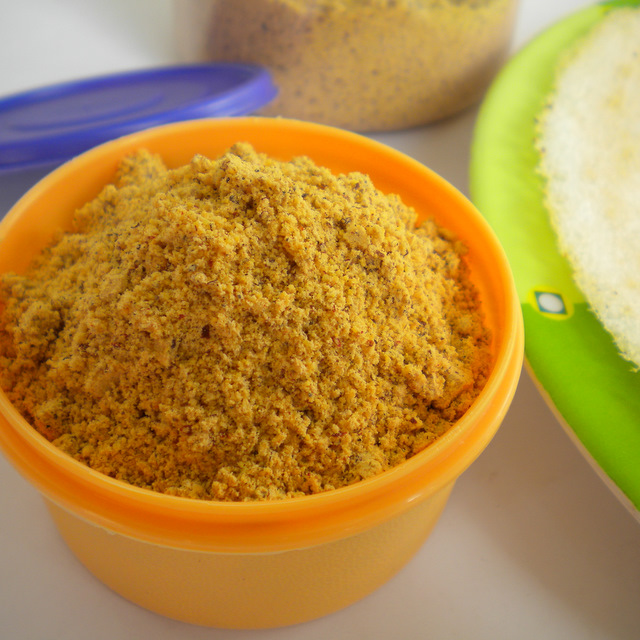 Put a tsp of this powder in a small katori and add 1 to 1 ½ tsp either melted ghee or gingili oil to it and mix it together. It is now ready to serve with hot idlis or dosas. You can also eat it with adais.