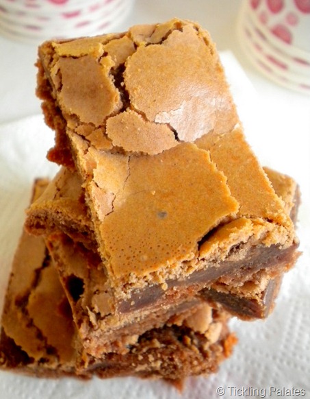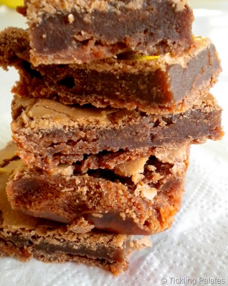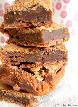 I had been wanting to try my hand at brownies for some time now and had been waiting for the square pan to get the shape perfectly. I scouted around for some brownie recipes that’s easy to bake and landed up here. This recipe sounded so easy and so I chose this one for my first brownie bake. I must say that I was not disappointed and the children loved it very much. The only thing I felt bad about was that I did not double the recipe and hence got thin sheet like squares unlike the fat ones I was hoping for. The fact that brownies will not rise like the cakes went completely out of my mind.