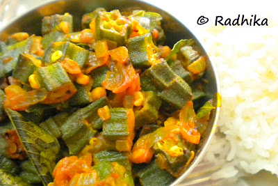 Don’t close the kadai with a lid and let it cook for at least 10 minutes till the okra turns crisp and well cooked. Add more oil at this stage if you really want it crisp. Garnish with coriander leaves and serve along with rice.