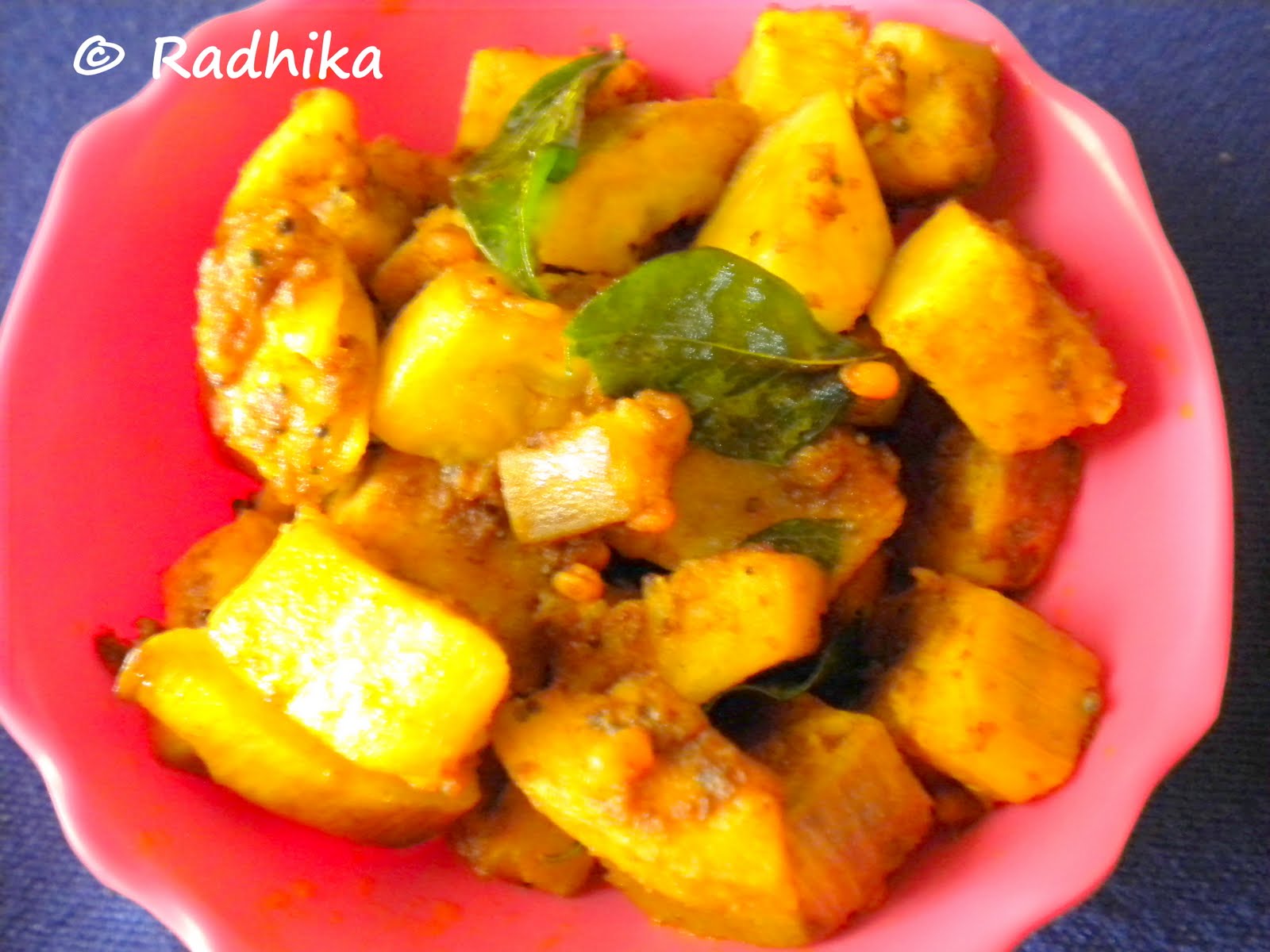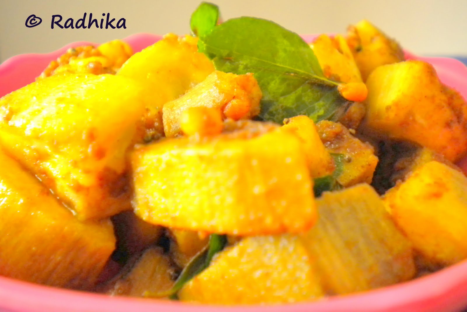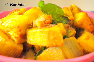 I liked Nandita’s traditional lunch series very much and have book marked a few recipes to try in future but this recipe is the one I tried as I had to please Arjun, my younger son as he likes plantain very much. If I didn’t he will start complaining that I make recipes only what Arun likes most. So this particular recipe is from her series.