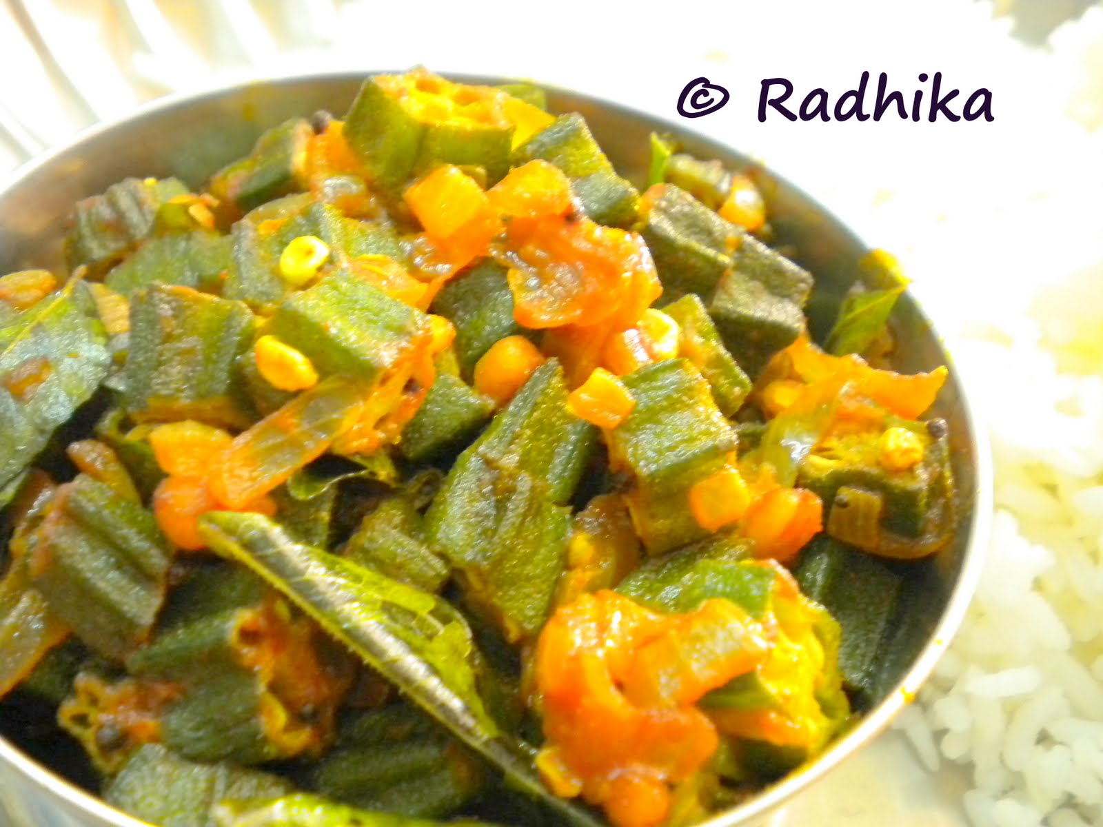 Don’t close the kadai with a lid and let it cook for at least 10 minutes till the okra turns crisp and well cooked. Add more oil at this stage if you really want it crisp. Garnish with coriander leaves and serve along with rice.