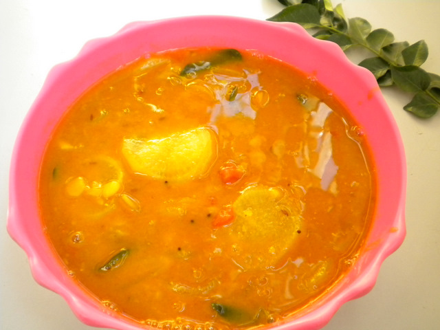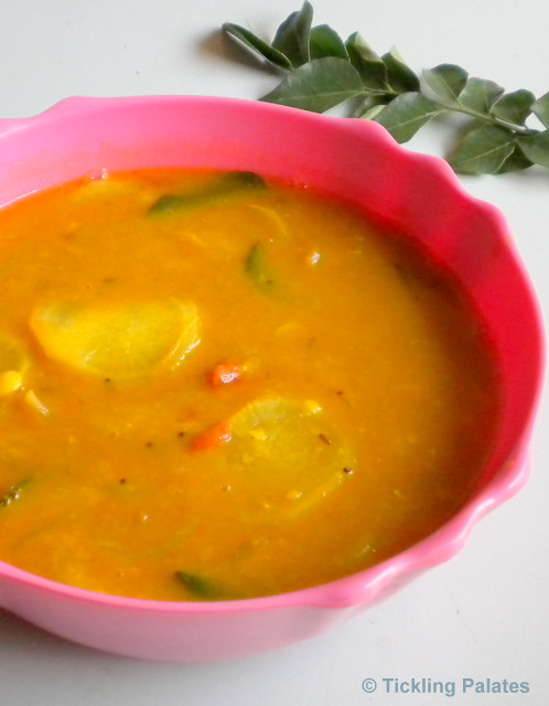 Wash Toor Dal and pressure cook it with 2 drops of Oil and ¼ tsp turmeric powder for 2 whistle. Mash well after it cools down. Soak tamarind in hot water and extract pulp from it. Chop onions, tomatoes, keep aside. Chop radish into thin round slices.