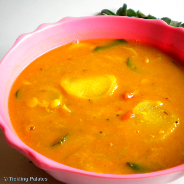 Now add the tamarind extract, turmeric powder, sambar powder, salt and mix well. Close with a lid and cook over medium flame till the raw smell disappears or for 10 minutes. Now add the mashed dal and water if required to the consistency you prefer and simmer for 5 minutes. Garnish with chopped coriander leaves.