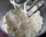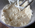 3. Cube the cold vegetable shortening and add it to the dry ingredients and run the hand mixer till they resemble bread crumbs.